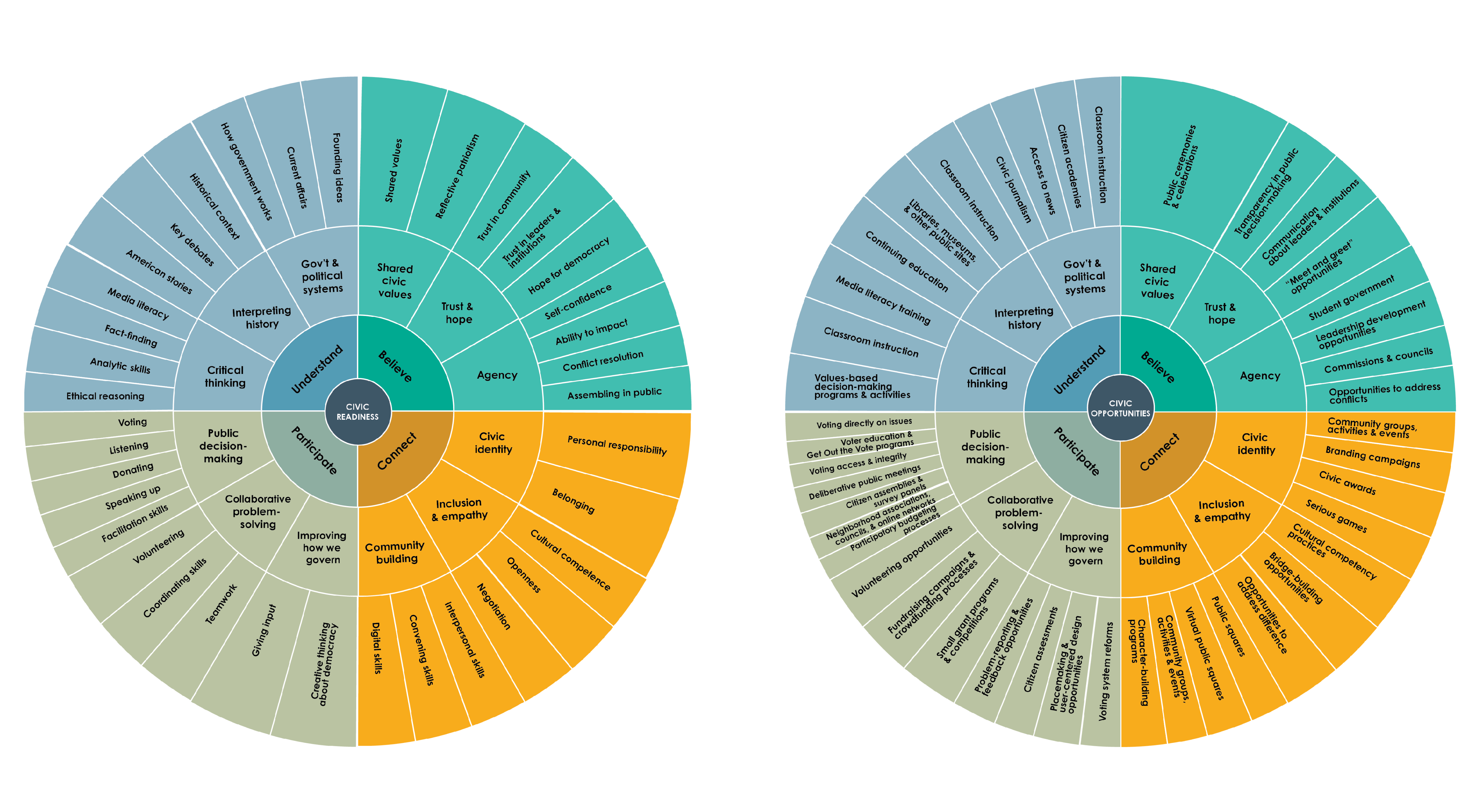 Based on these interviews and resource collection, Citizens & Scholars has developed a framework for organizing the ways that people in many different sectors—education, business, philanthropy, community institutions, media, government, and civil society—are defining and measuring different aspects of civic readiness and civic opportunities. This framework is presented as the Civic Measurement Maps.